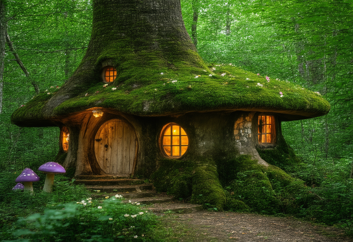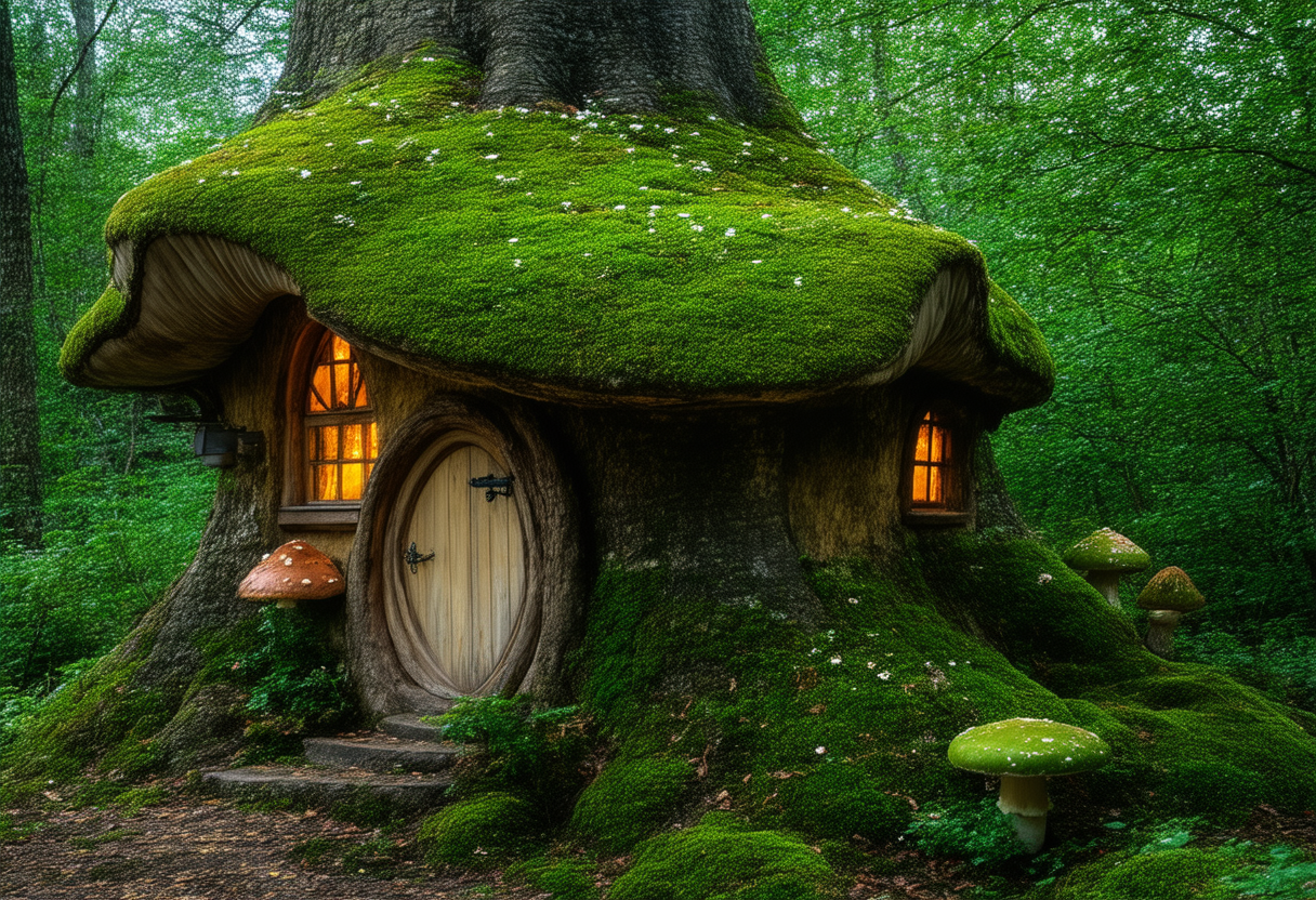 프롬프트: Award winning photography, A whimsical, fairy-tale house nestled in a lush forest, House is made from a large, hollowed-out tree stump or mushroom, with a roof covered in vibrant green moss and small flowers, The structure has a rustic charm, Warmly lit windows, Cozy and inviting appearance. Surrounding the house are various mushrooms and lush green foliage, Enchanting forest atmosphere, Soft, magical lighting, Serene woodland backdrop