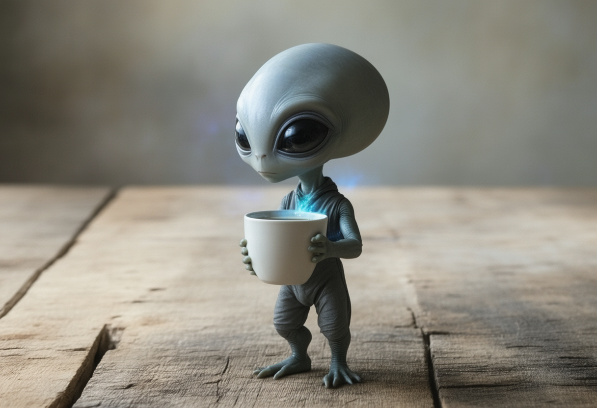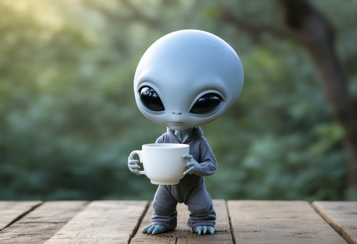 프롬프트: An alien with skin the color of moonlight, wearing a small gray jumpsuit, stands upright on a rustic wooden table, its spherical body resting on four leg-like appendages. Its enormous, almond-shaped, silver eyes fixate on the white porcelain mug it holds in two of its six appendages, slowly tilting it for a sip. The liquid within glows a soft blue, illuminating the alien's curious, peaceful expression.