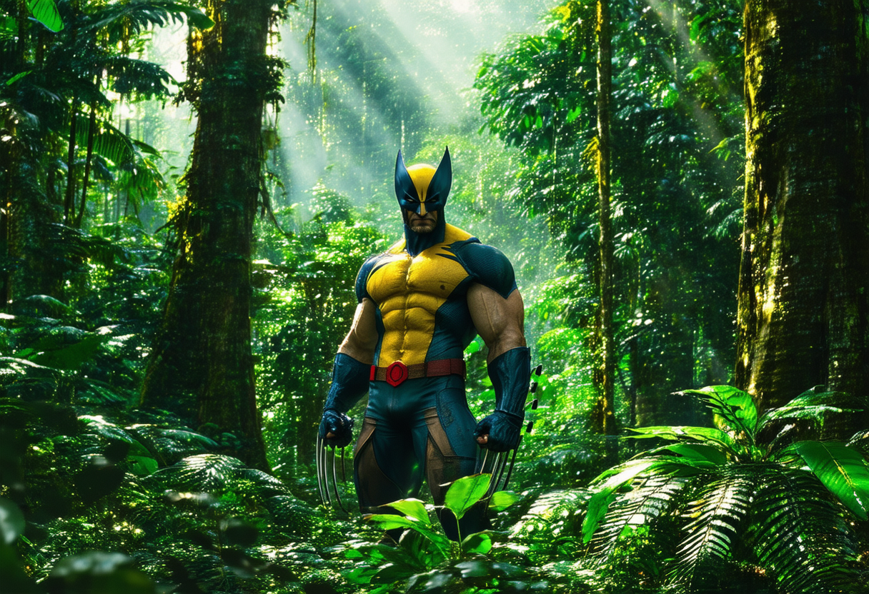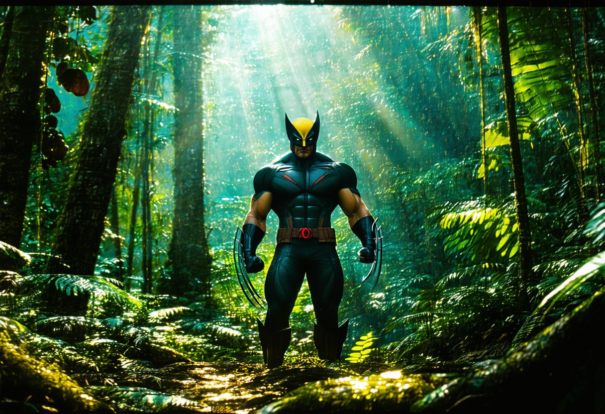 프롬프트 : In a lush, verdant jungle, Wolverine stands tall. Basking in the golden glow of a late afternoon sun, casting long, dramatic shadows on the rainforest floor. film grain evokes Wes Anderson's precise, whimsical aesthetic with a hint of Deakins' realistic textures.