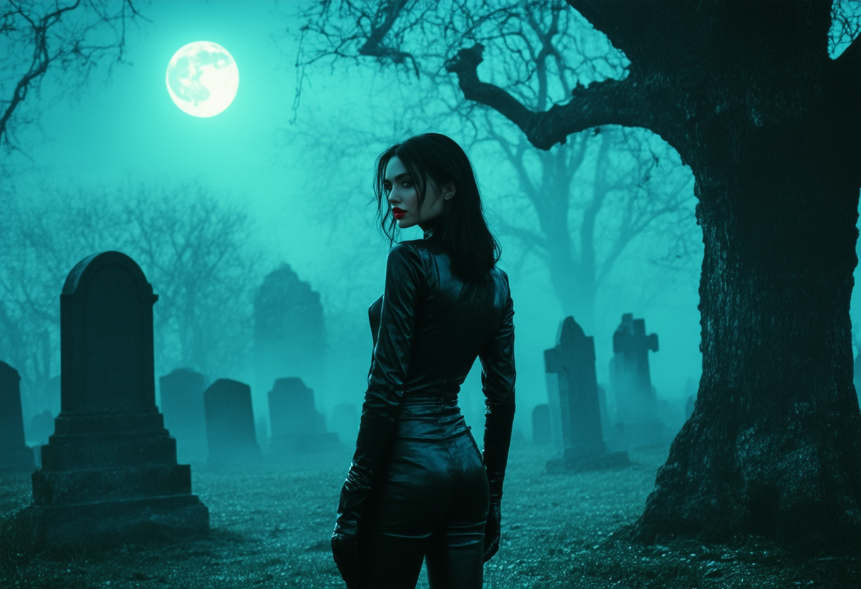 프롬프트: In moody neo-noir ambiance, a luminous vampire huntress posed in profile, wears a form-fitted black leather catsuit, her pale skin glowing under the silver moonlight spilling from the full moon. Her ruby red lips are parted. The graveyard, shrouded in an ethereal blue mist, fades into the shadows, marked by the distant gnarled trees and crumbling monoliths. Rembrandt-like chiaroscuro provided by a single backlight source, casting deep, dramatic shadows and accentuating the huntress's lean form. Softened film grain, teal and orange color grading, with a hint of lens flare from the moon.