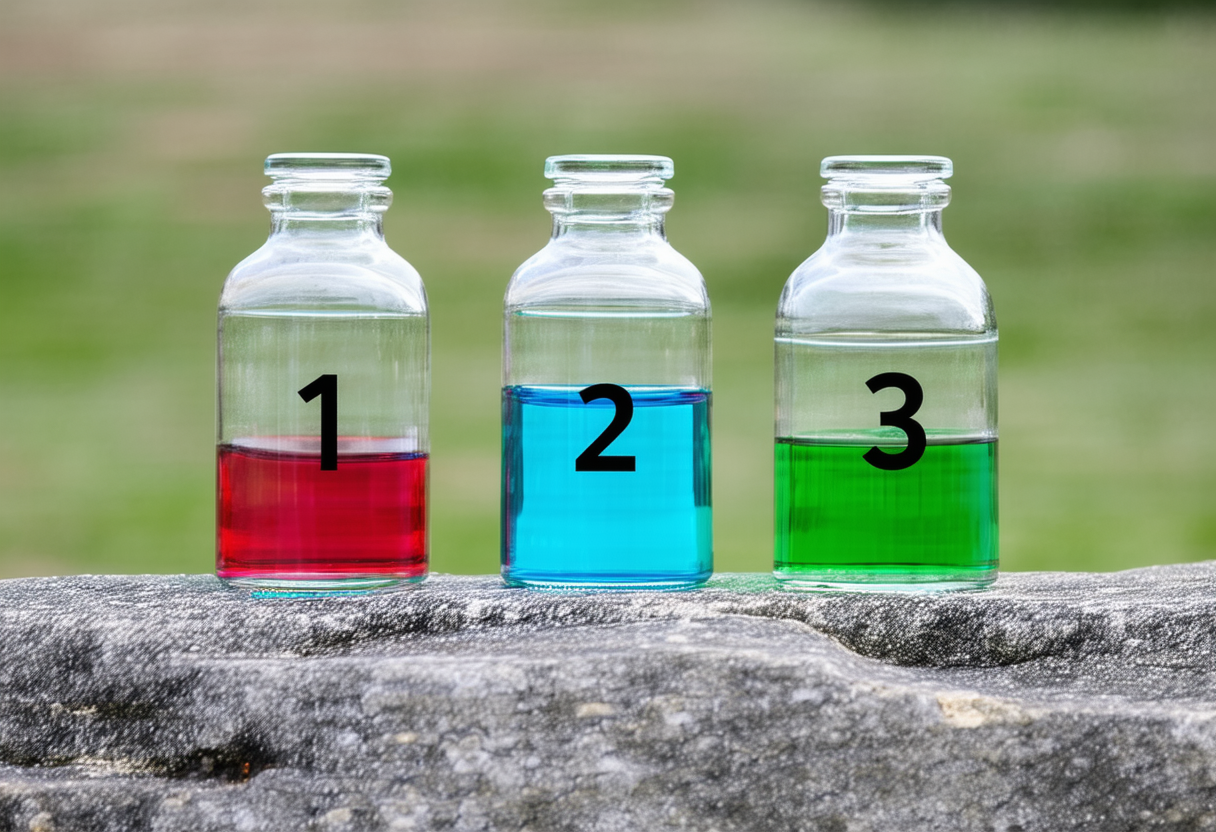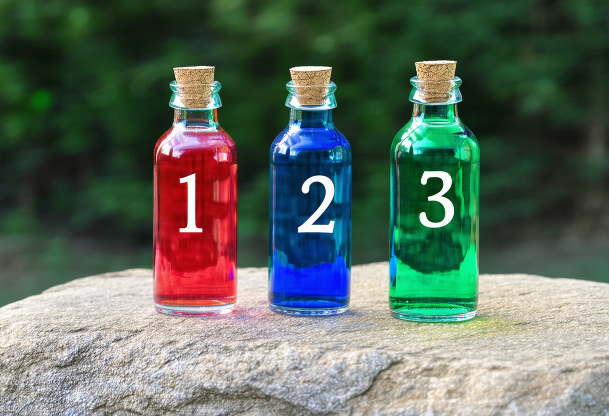 프롬프트: Three transparent glass bottles on a stone. The one on the left has red liquid and the number 1. The one in the middle has blue liquid and the number 2. The one on the right has green liquid and the number 3