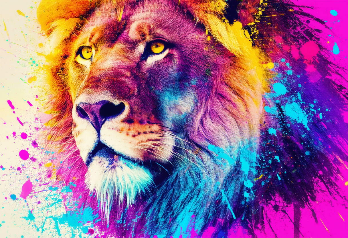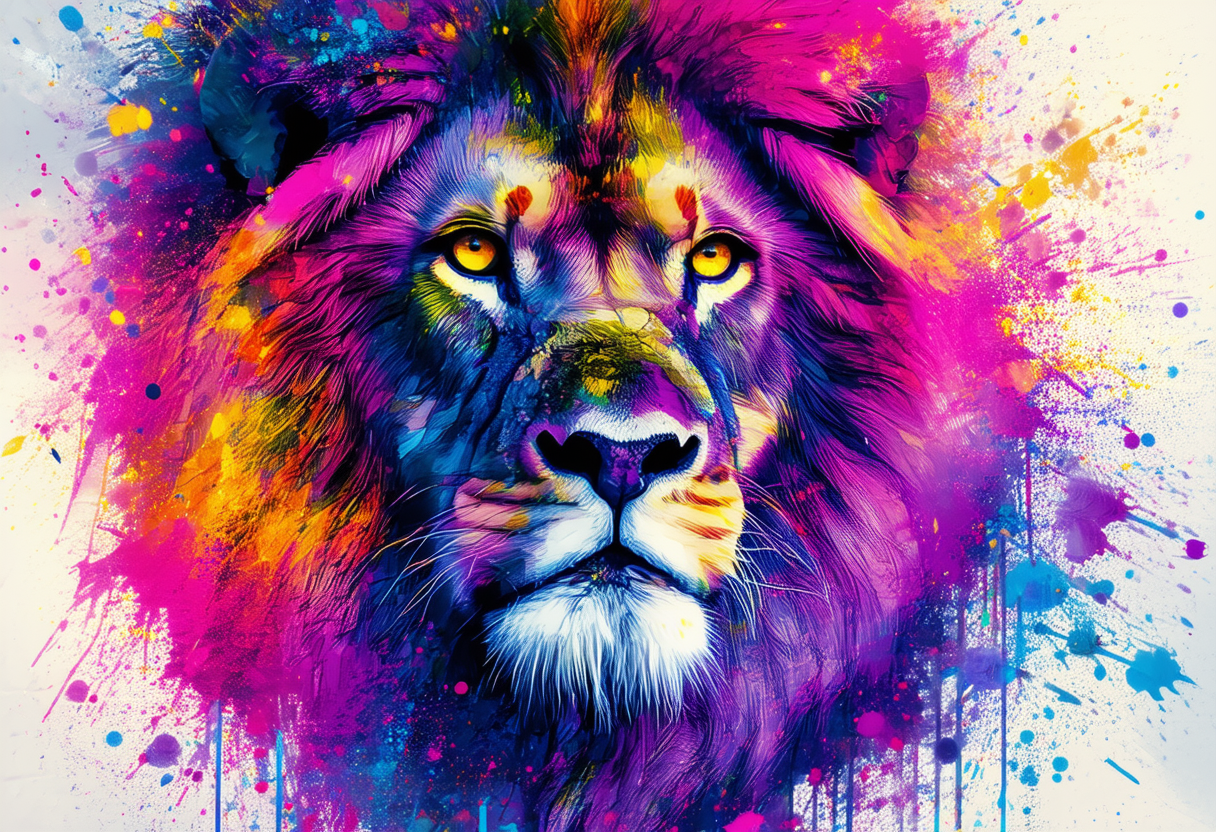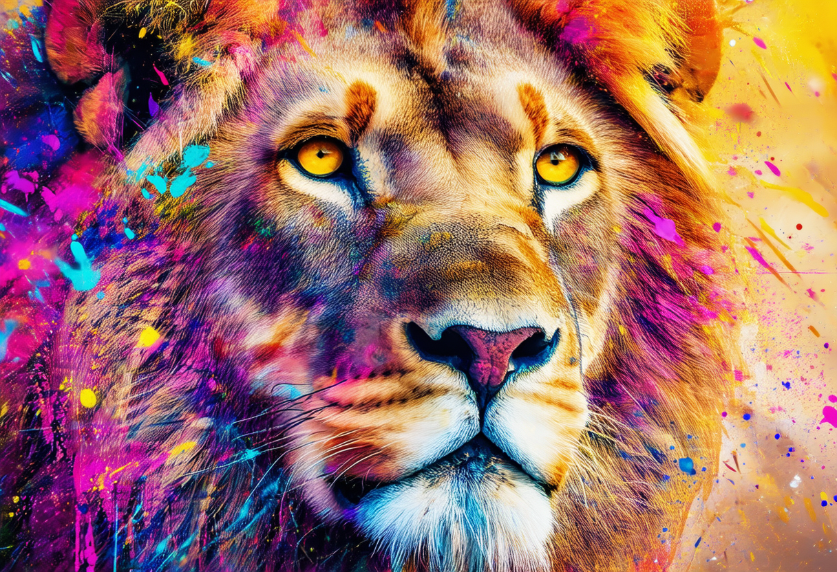 프롬프트: a vibrant, digital artwork featuring a close-up of a majestic lion's head. multicolored explosion of paint splatters, with hues ranging from deep purples and pinks to bright yellows and blues. The lion's eyes are a striking, intense yellow, giving the impression of a fierce, powerful gaze.