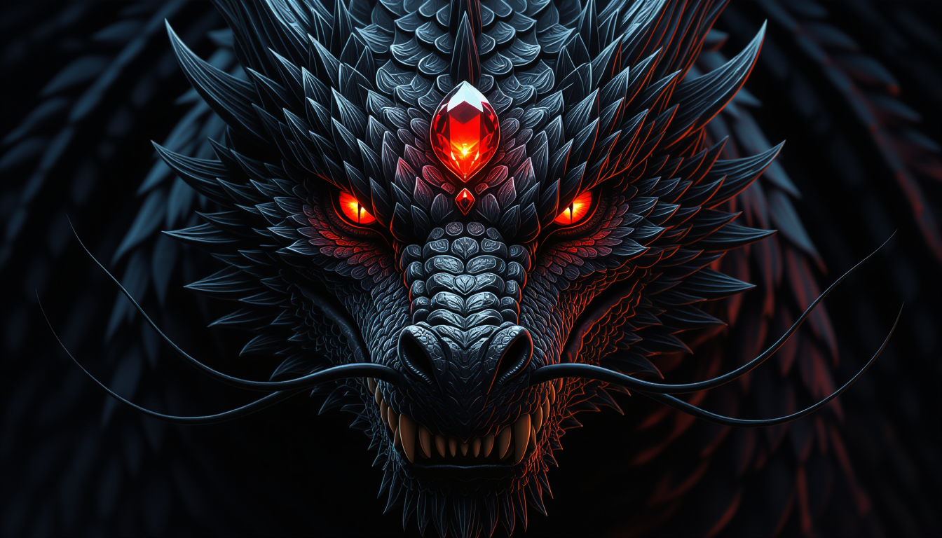 프롬프트: a highly detailed, hyper-realistic digital artwork of a fearsome dragon.Its eyes are a striking, glowing red. The dragon's face is adorned with intricate, black scales. A prominent, red gemstone adorns its forehead.