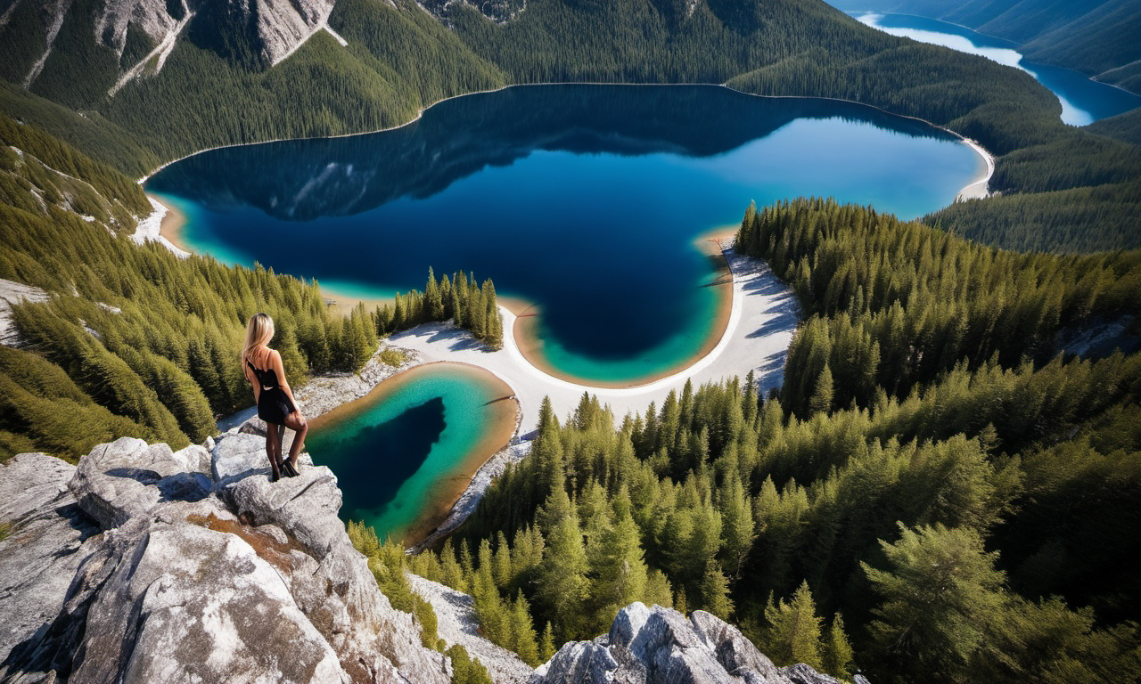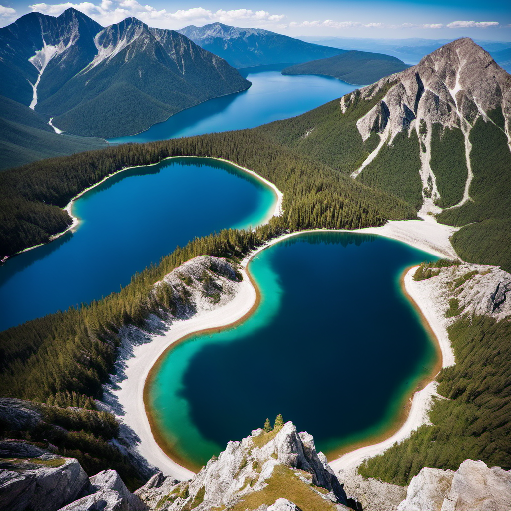 An aerial photograph capturing a view from the top of a high mountain, looking down at a pristine lake [Style Selector - glamour]