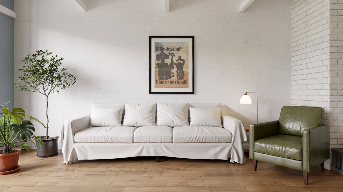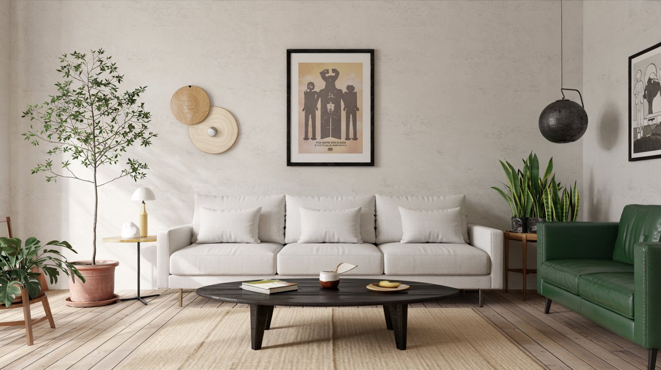 영문 프롬프트: Photorealistic image of a Nordic-style living room scene. A long white covered sofa sits in the center of the wall, flanked by a green leather one-seater sofa to its right. To the left of the sofa is a potted plant with thin tall tree. On the wall above the sofa is a picture frame with a poster.