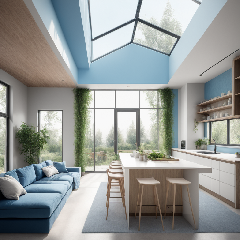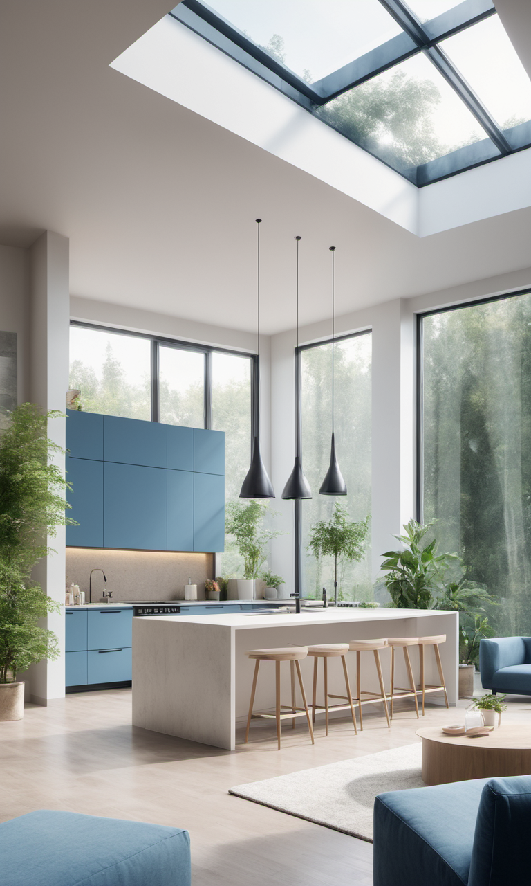 Interior Design, a perspective of a living room and a kitchen with an island, large windows with natural light, Light colors, blue point color, vegetation, modern furniture, skylight, modern minimalistic design