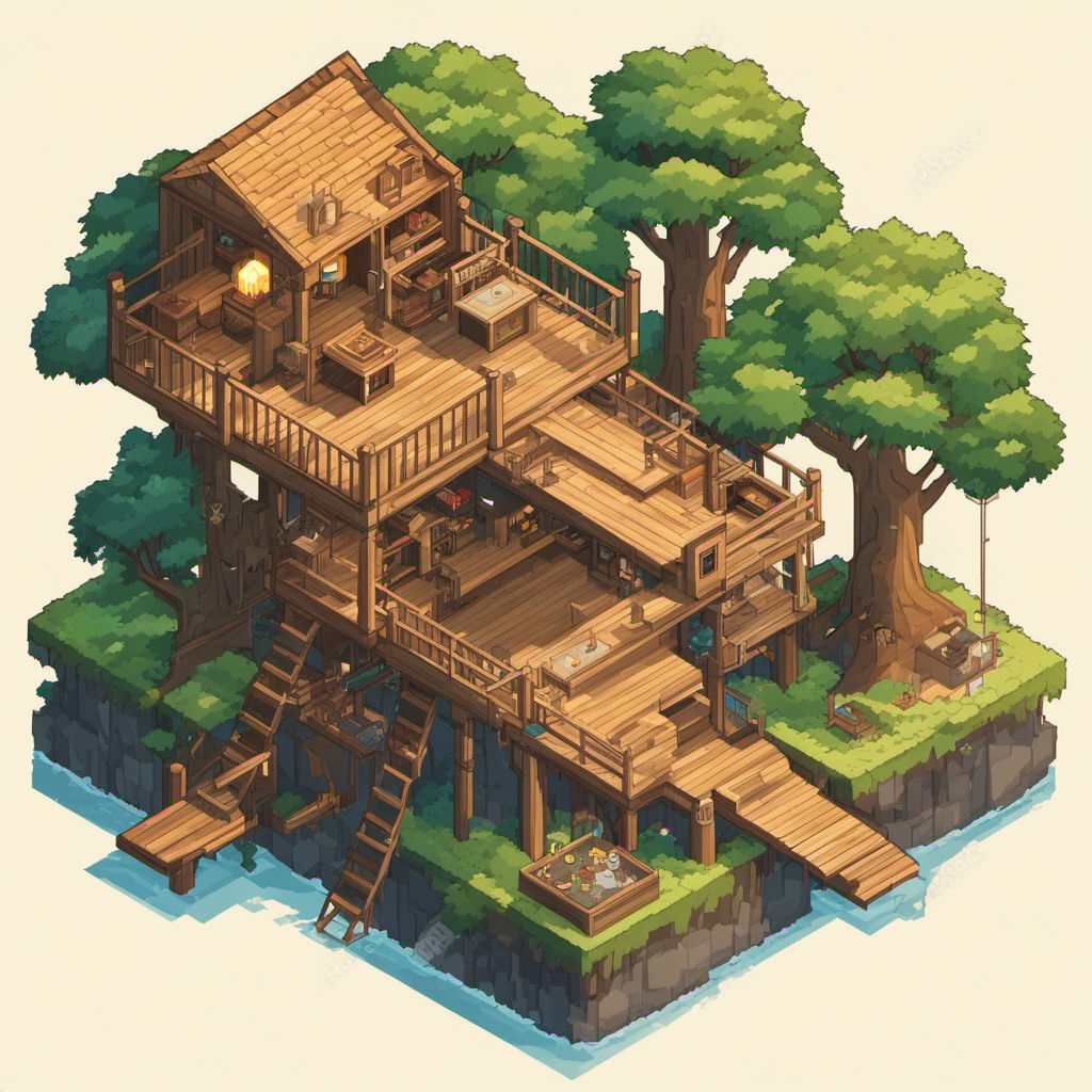 Isometric clean pixel art image cutaway of inside of tree fort [StyleSelector - enhance]
