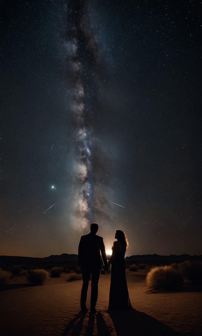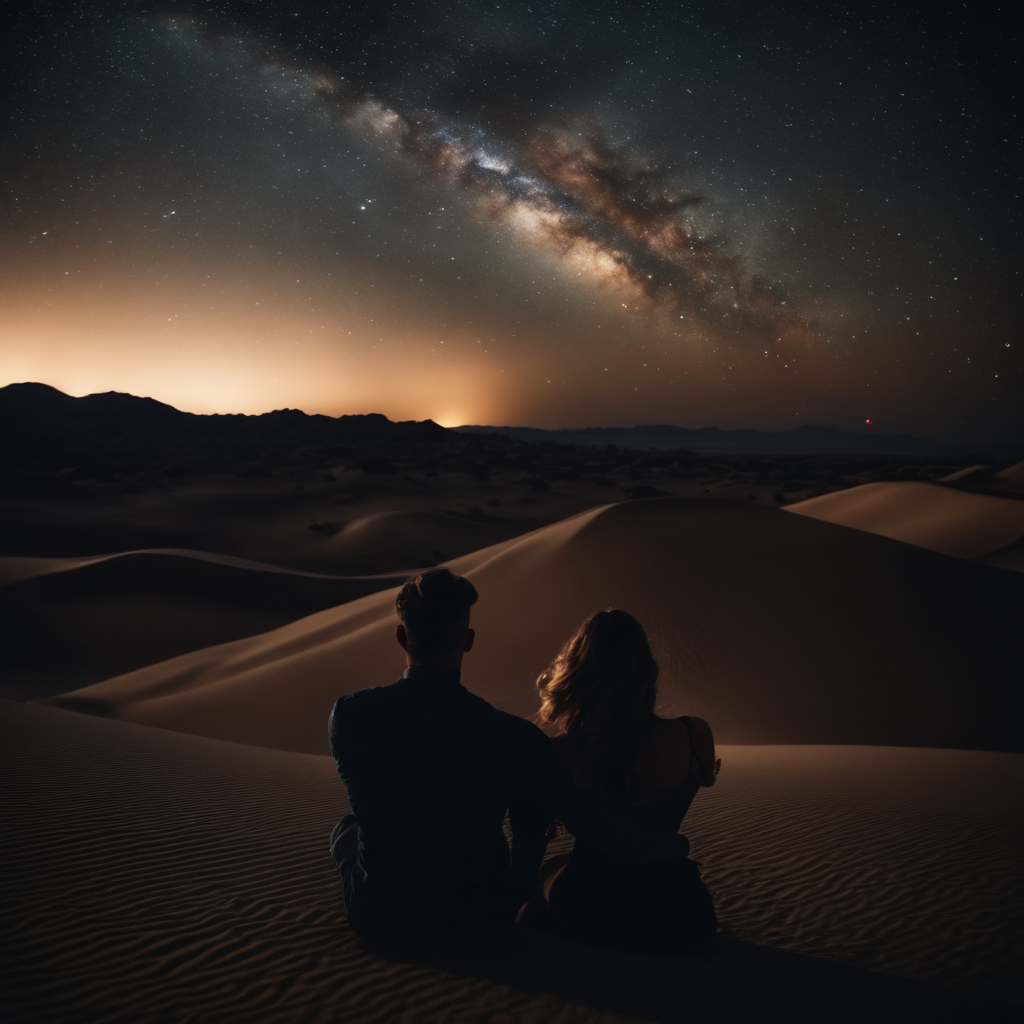 Photo of A couple of lovers staring at the milkyway, dark and dim in midnight, in the desert, highly detailed, wide-angle lens [Style Selector - cinematic]