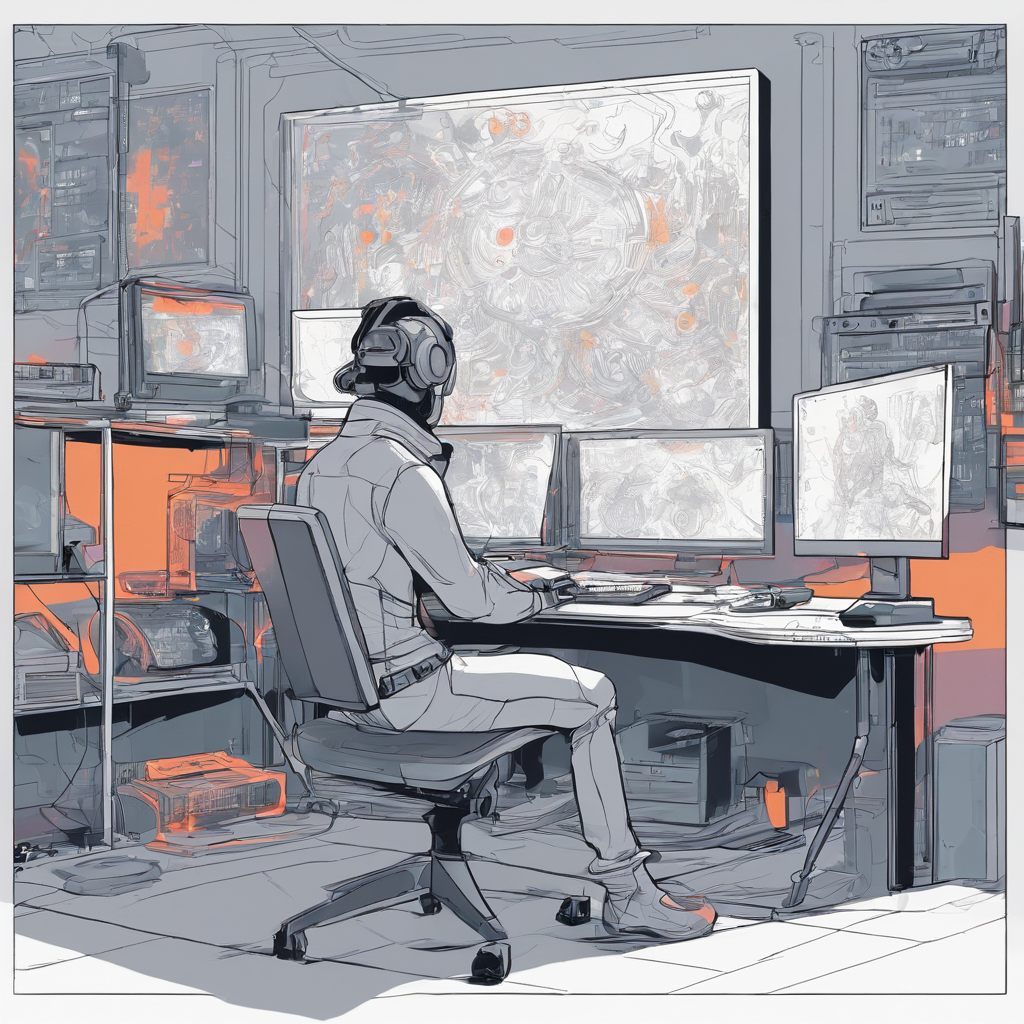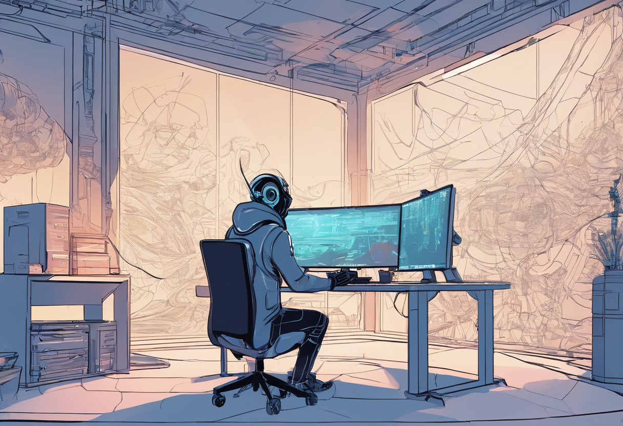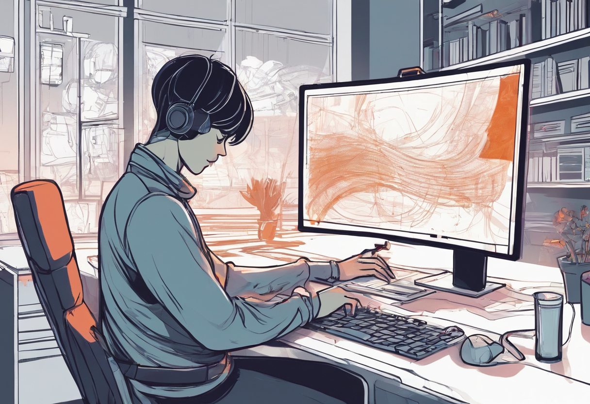 an AI artist, in front of computer, using stable diffusion, AI drawing in screen