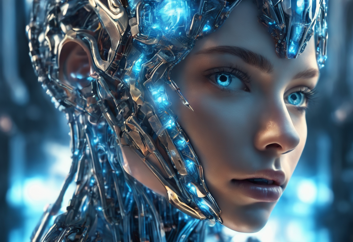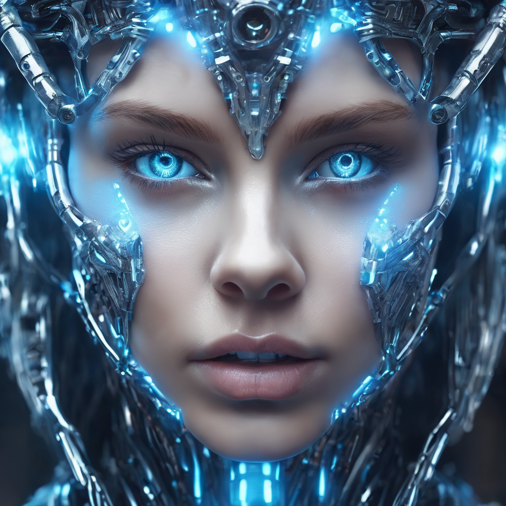 A human like complicated complex cyborg of a aesthetic adroned beautiful young women with glowing crystal silky skin, glowing blue eyes wide open, intense view, hyperdetailed, close-up