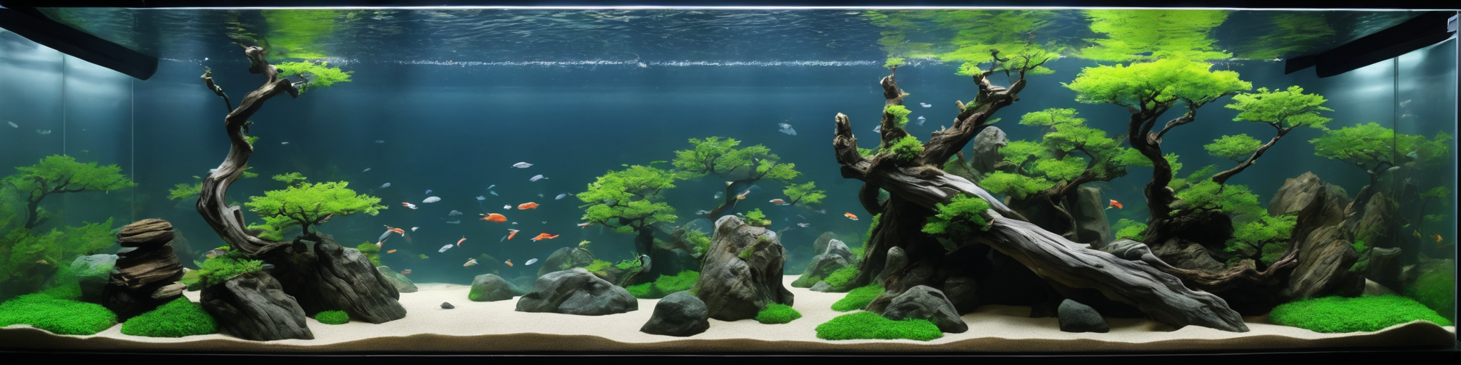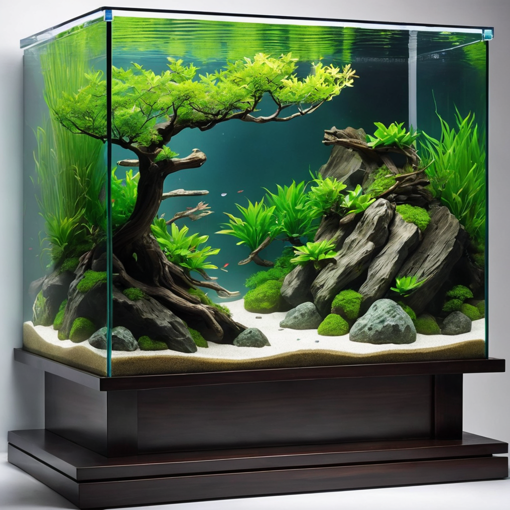 프롬프트: a photo of cube fish tank, japanese style, Yamano, meticulously arranged rocks, captivating driftwoods, lush freshwater aquatic [Style Selector - enhance]