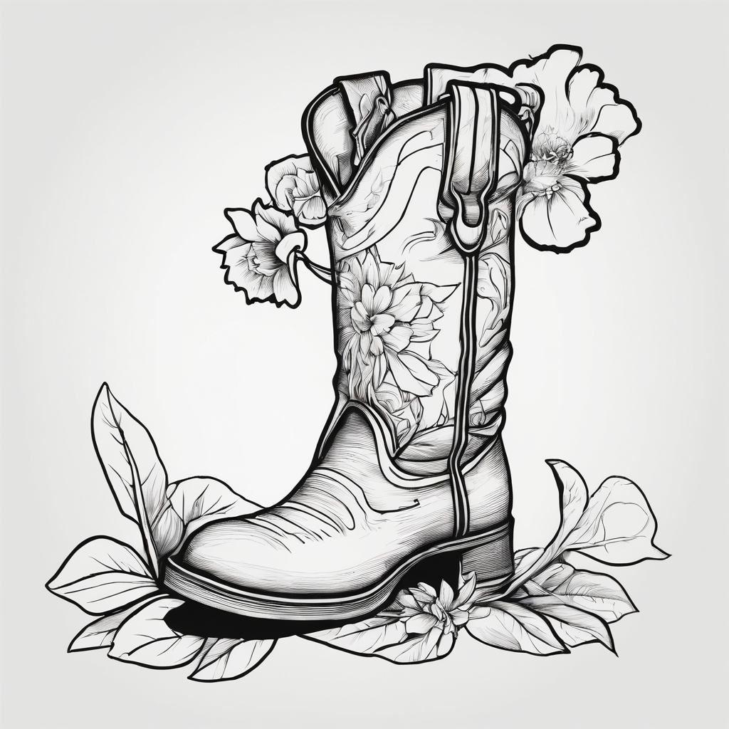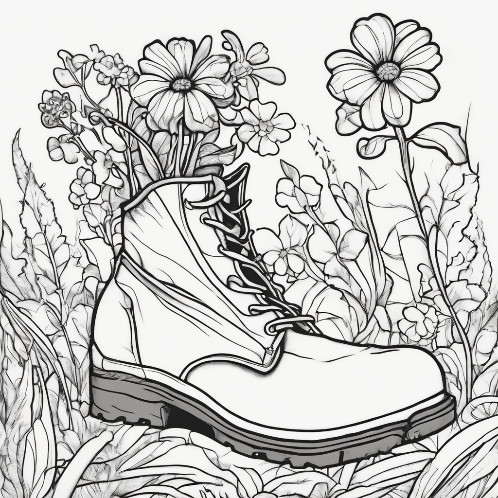 clean coloring book page of a boot with a flower growing out of it, black and white
