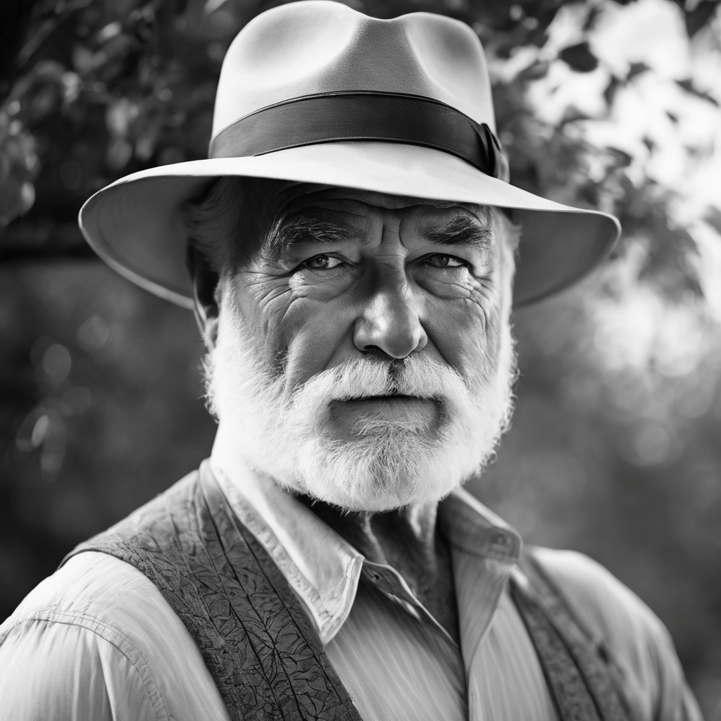 Ernest Miller Hemingway, black and white portrait photography, 3 quarter lighting, depth of field, f2.8, 50mm lens, exquisite detail, intricately-detailed, award-winning photography, high-contrast, High-sharpness