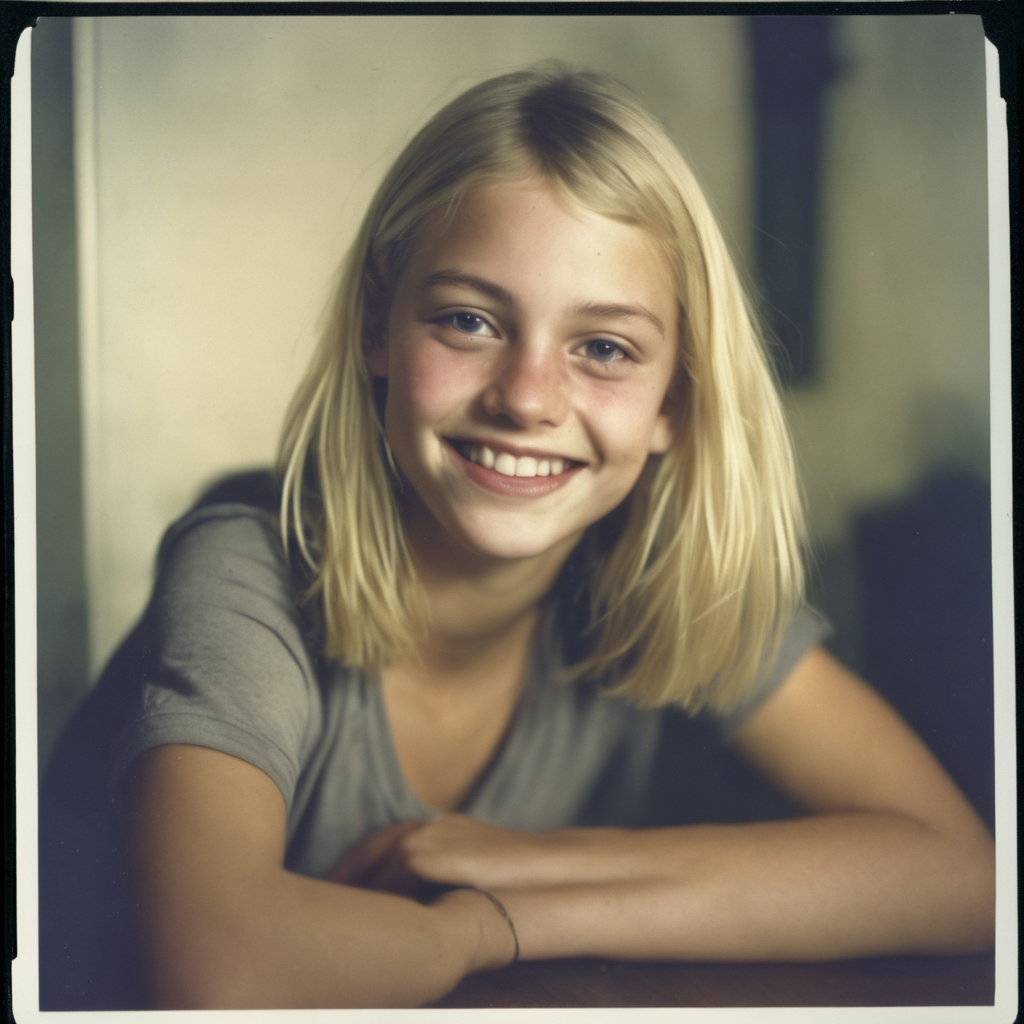 blonde girl leaning on table and smiling at camera, early 2000s, flash photography, faded color, desaturated, grain, polaroid, 1991