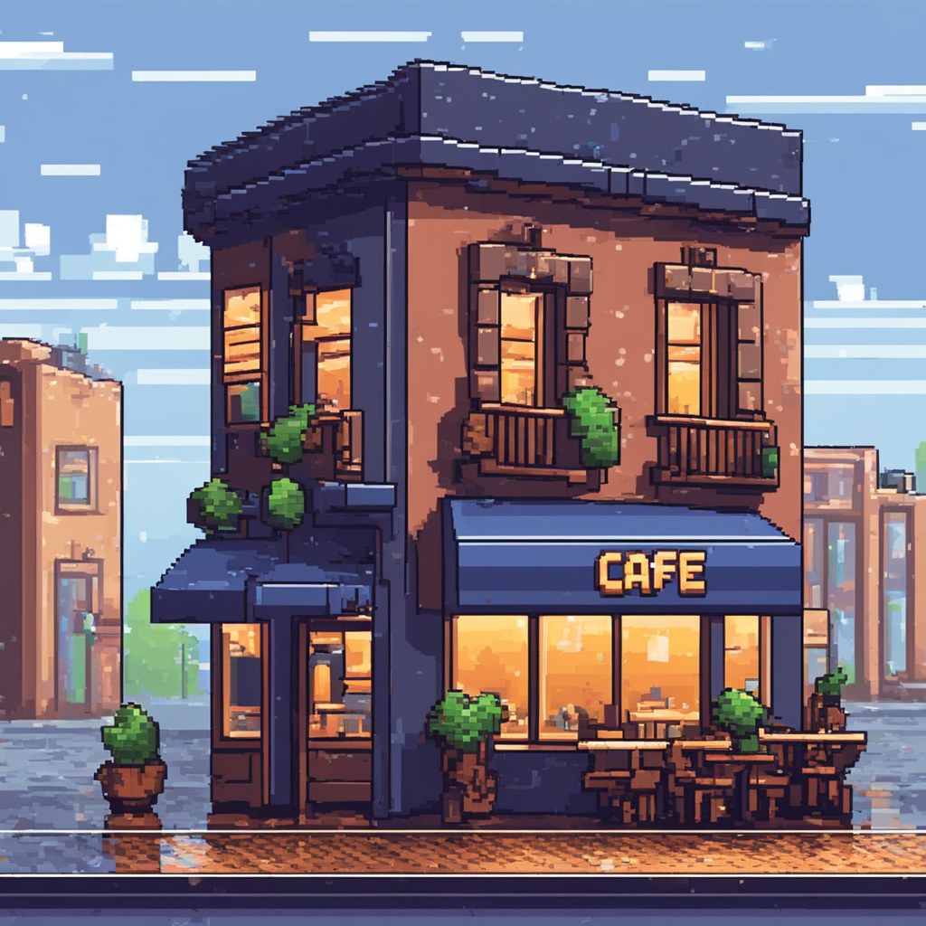16-bit pixel art, outside of café on rainy day, light coming from windows, cinematic still, hdr [Style Selector - pixe-lart]