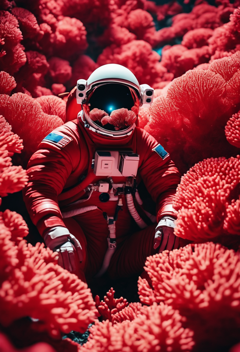무한한 우주를 탐험한 후 빨간 산호초 군락으로 향한 우주인의 모습은 마치 과학과 꿈의 만남 같다. 우주복은 그의 두 번째 피부가 되어 외부 공간의 무서움을 막아주고, 그의 눈은 아름다운 산호초 아래의 신비로운 세계에 빠져들게 한다. 시간이 멈춘 듯한 빨간 산호초 속에서 바다의 속삭임에 귀 기울이며, 지구의 보호자로서 자연을 지키는 사명을 실천한다. 그의 휴식은 우주와 대자연 간의 조화로운 만남의 순간이다.
