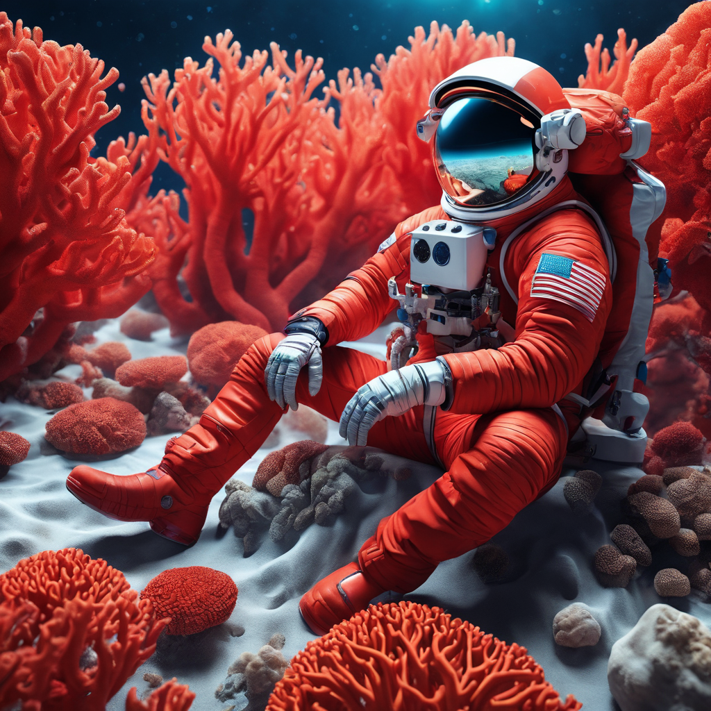 Astronaut in a red spacesuit resting amid a red coral reef colony [Style Selector - enhance]