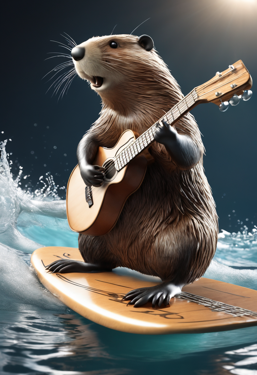 비버 한 마리가 파도 위에서 기타를 연주하며 서핑을 즐기는 모습을 상상해 보았다. 그의 작은 몸집이 파도를 따라 춤추며, 노래는 바다에 울려 퍼진다. 비버는 물 위에서 자연스러운 미소를 흘리며 서핑 보드 위에 서 있다. 비버 눈에는 태양과 바다가 춤추고 있고, 그의 음악은 파도와 함께 우리 모두를 환상적인 모험의 세계로 안내한다. 이 작은 비버의 모험은 자연과 음악, 그리고 무한한 상상력이 만나는 순간이다.