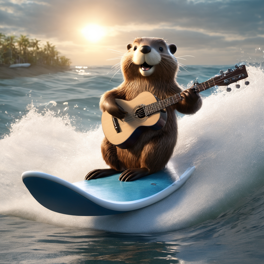 비버 한 마리가 파도 위에서 기타를 연주하며 서핑을 즐기는 모습을 상상해 보았다. 그의 작은 몸집이 파도를 따라 춤추며, 노래는 바다에 울려 퍼진다. 비버는 물 위에서 자연스러운 미소를 흘리며 서핑 보드 위에 서 있다. 비버 눈에는 태양과 바다가 춤추고 있고, 그의 음악은 파도와 함께 우리 모두를 환상적인 모험의 세계로 안내한다. 이 작은 비버의 모험은 자연과 음악, 그리고 무한한 상상력이 만나는 순간이다.