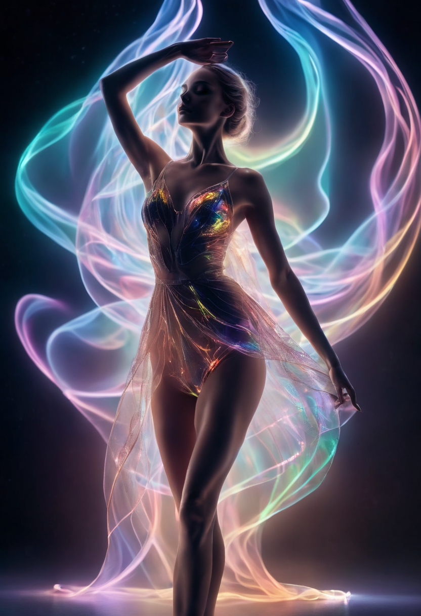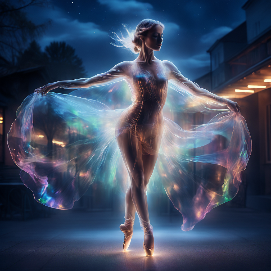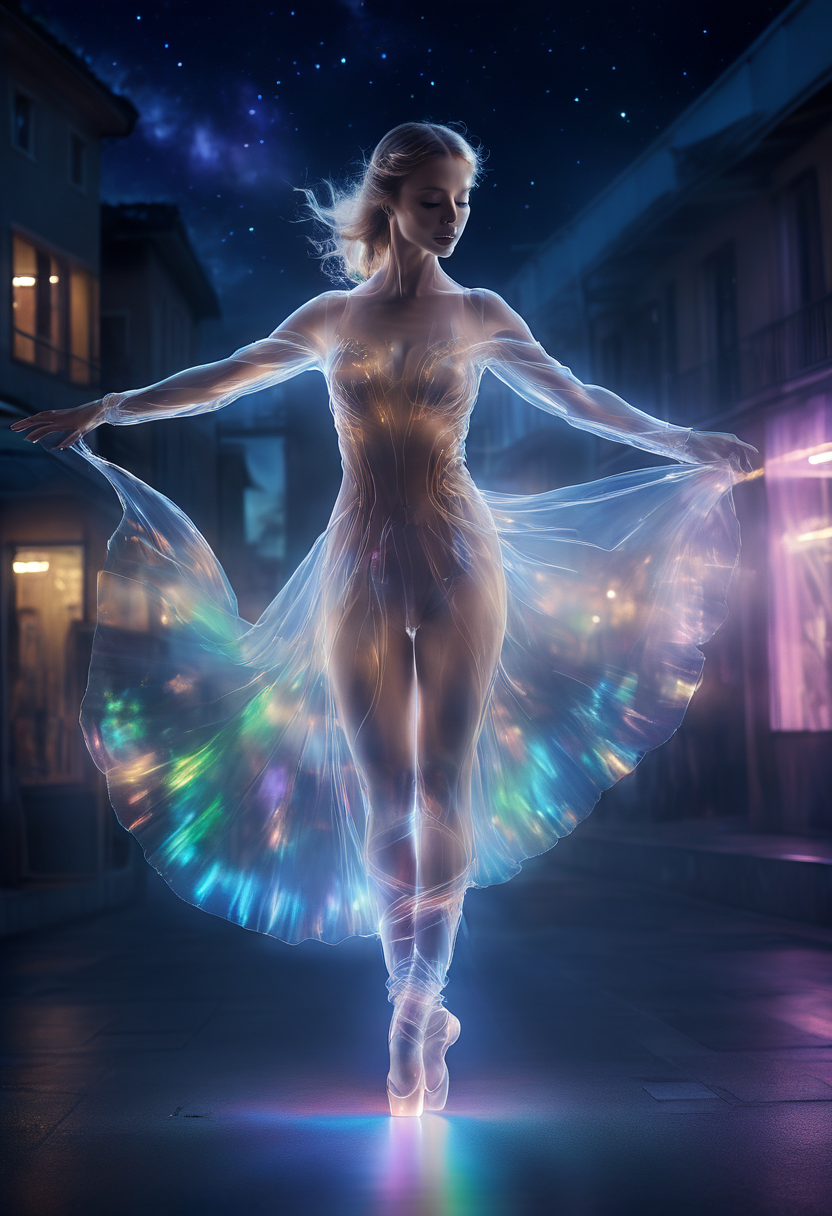 hyperdetailed contours of beautiful (translucent:1.2) nude ballett woman silhouette imposing in night sky scenery with iridescent neon complex contours, photography by LAPP-PRO, Hannu Huhtamo, Michael Bosanko. impressive dynamic, glowing particles, sparkling, long exposure, amazing depth <lora:Aether_Ghost_v1.1_LoRA>