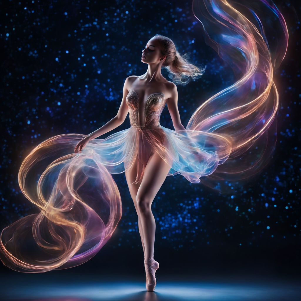 밤하늘에 별들이 빛나고, 별빛 아래 우아하게 춤추는 발레리나의 실루엣은 마치 우주의 소리와 노래에 대한 무한한 사랑의 표현인 듯하다. 달콤한 음악에 몸을 맡기며, 우아한 포즈와 바람에 흔들리는 듯한 동작은 자유와 아름다움을 상징한다. 그녀의 춤은 별빛을 따라 흐르며, 우리 마음을 감동시키고 우리 영혼을 빛나게 한다. 그 순간은 마치 우주와 미적인 예술이 하나가 된 것처럼 아름답다.