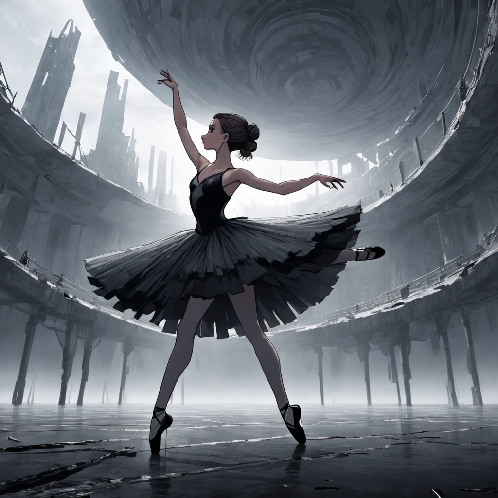종말이 닥친 세계에서도 아름다움은 존재한다. 발레리나는 파괴와 상실의 그림자 속에서 춤을 추며, 우리에게 희망의 빛을 던진다. 그녀의 우아한 동작은 절망을 뚫고 희망의 날개를 펼치는 듯 하다. 종말에도 포기할 수 없는 예술과 열정. 그녀의 춤은 용기와 삶과 희망을 기념하며, 끝이 아닌 새로운 시작을 상기시킨다.