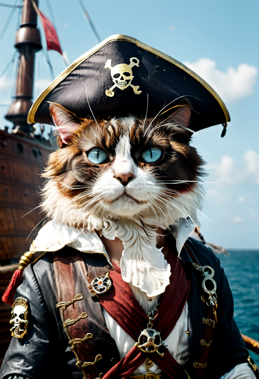 Anthropomorphic cat pirate capitan, salty sailor, voilent . Cinematic movie still