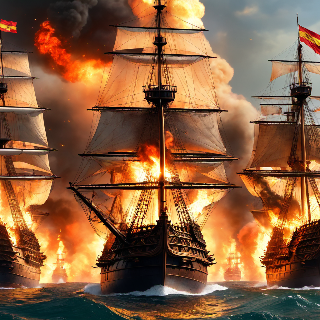 large fleet of Spanish Armada ships in flame, covered in fire and sparks, English channel, epic sea battle, Medieval Tudor England, filmic, overcast, 8k, UHD, best quality, highly detailed, cinematic