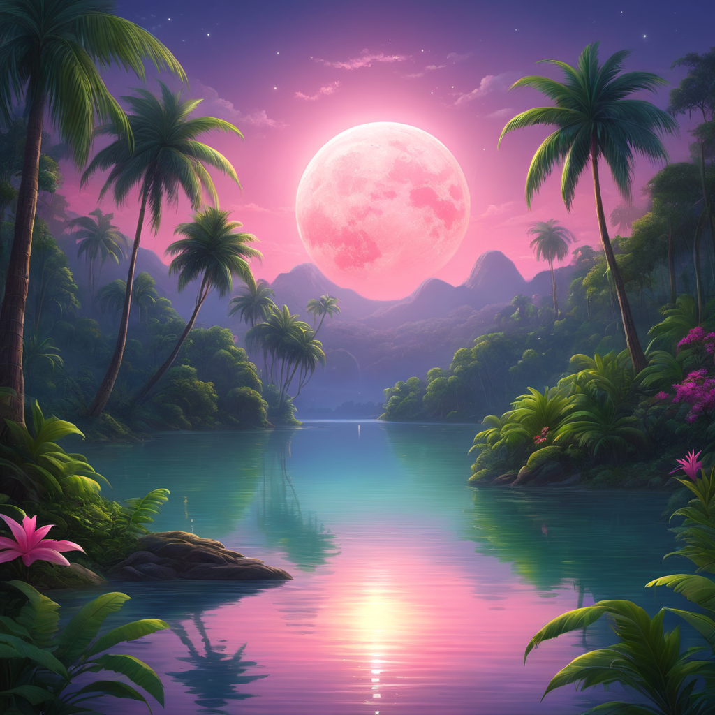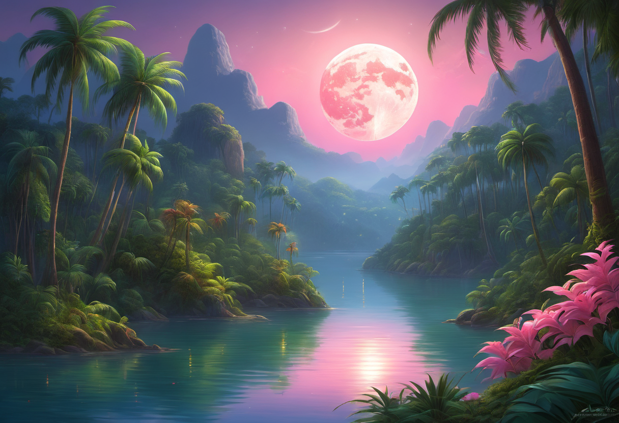 A tropical rainforest night. A tranquil lake surrounded by palm trees, a pink moon is shining, by Evgeny Lushpin [Style Selector - fantasy art]