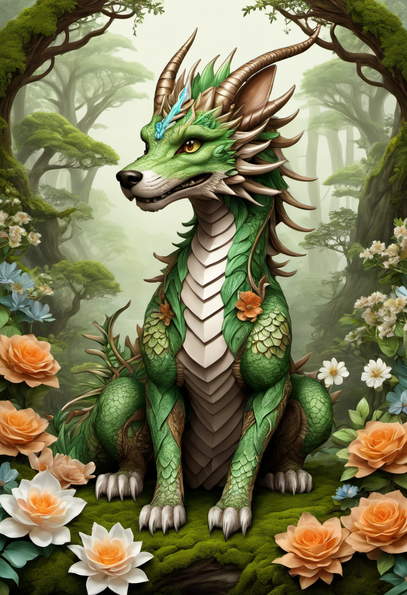 hand drawn art of a beautiful earthen dog dragon hybrid, flowers moss, tree branches, dryad, symmetrical dragon horns, digital art, intricate detailed