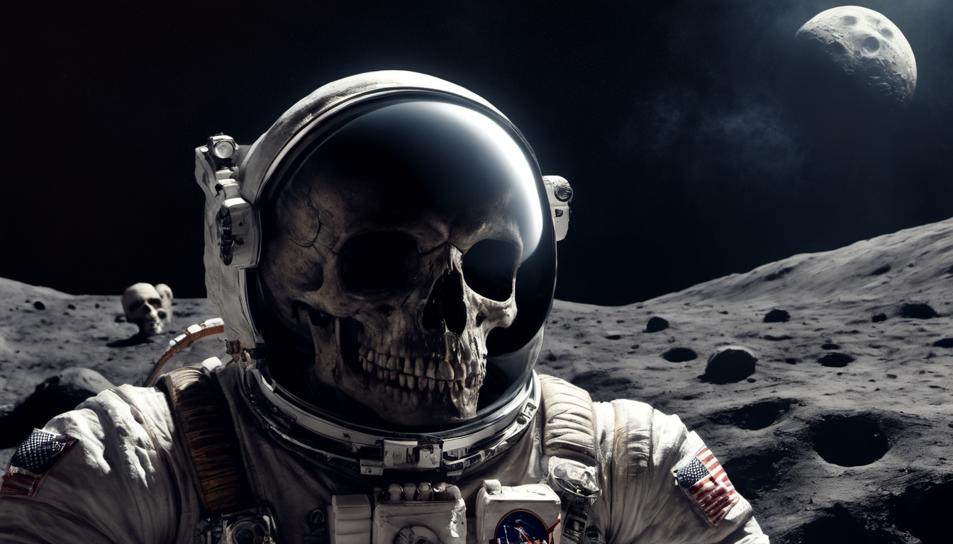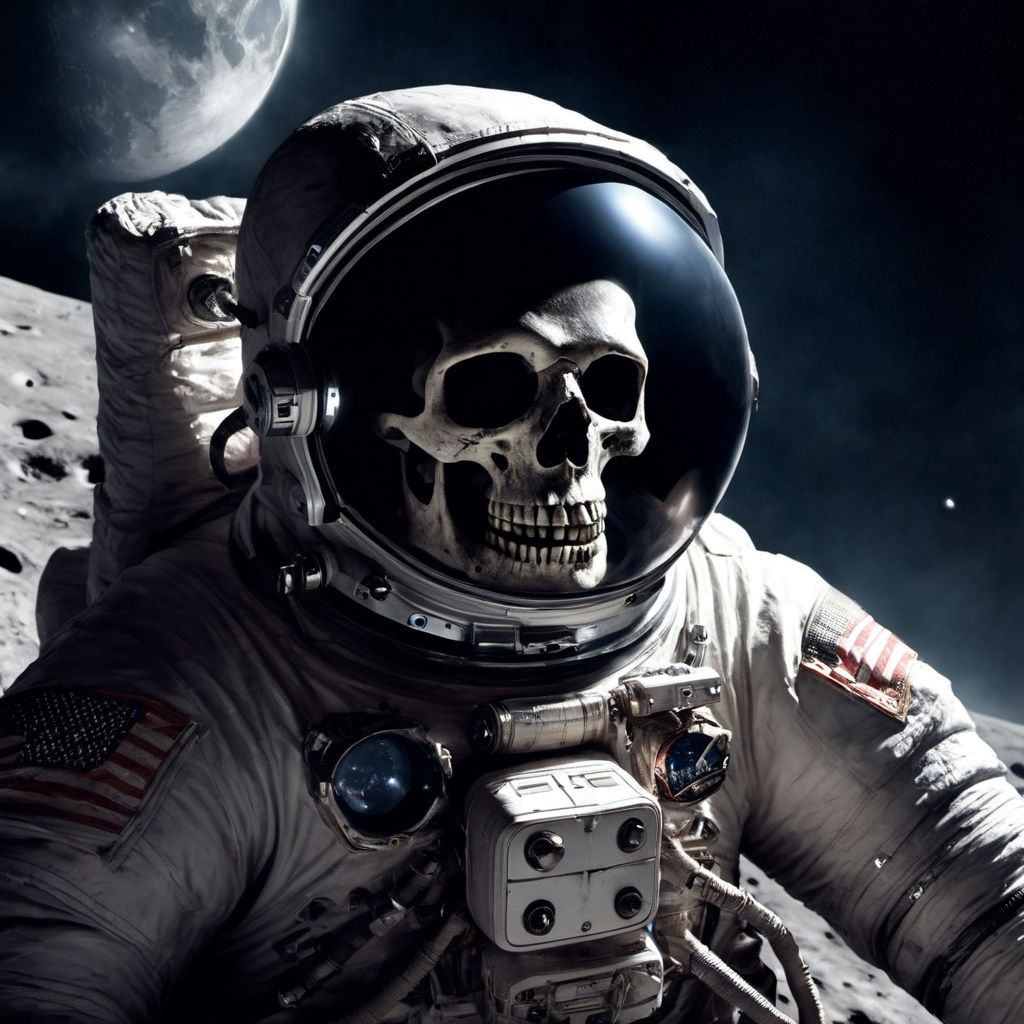 astronaut on the moon, space suit, skull seen from the inside of the helmet, dying, dark, creepy, dead, Eerie, unsettling, dark, spooky, suspenseful, grim, highly detailed [Style-Selector - horror]