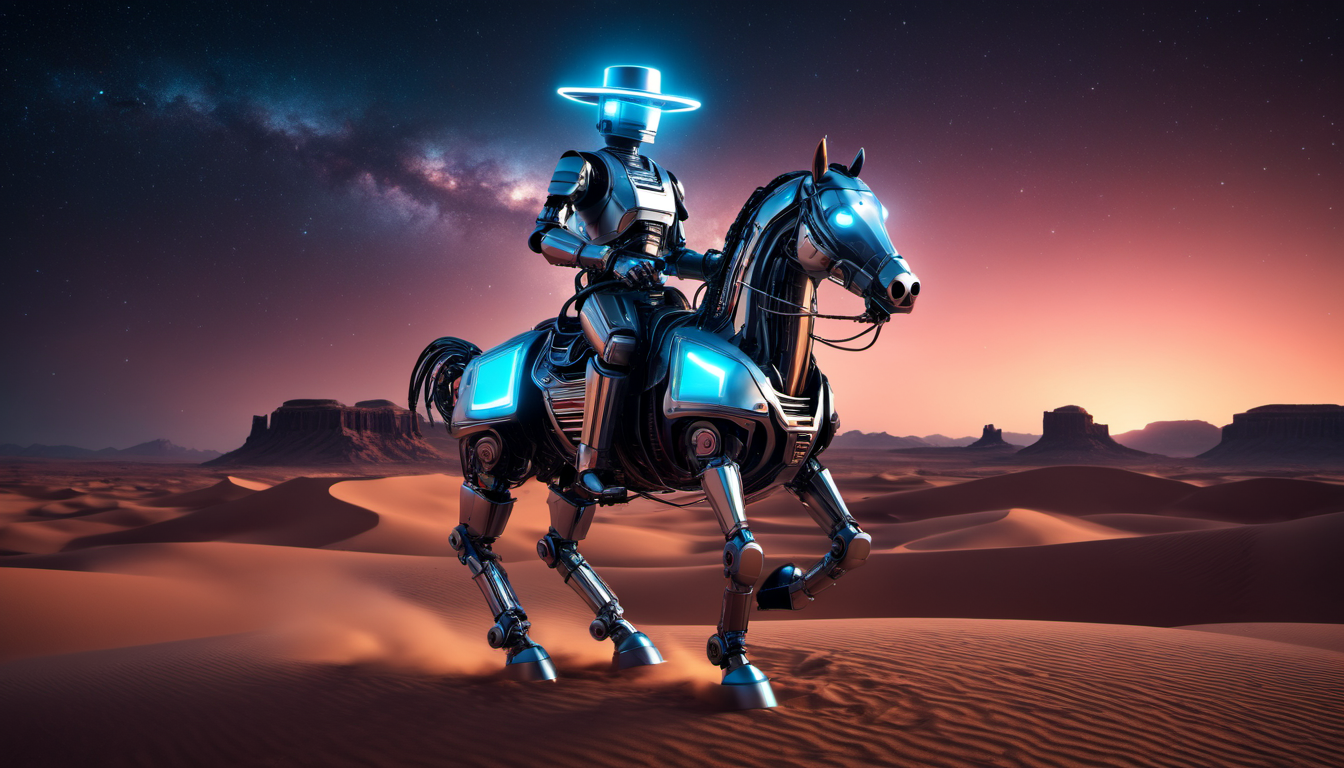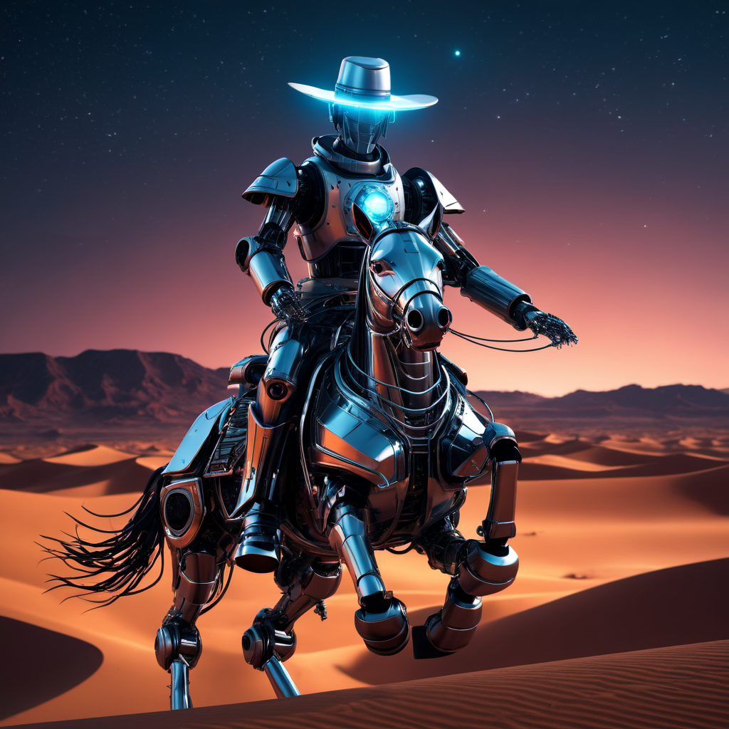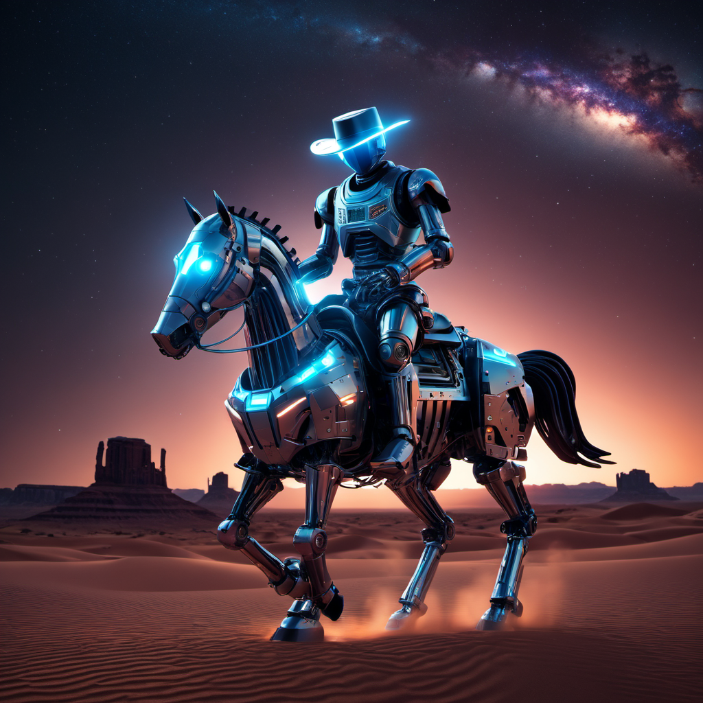 a robot cowboy riding a horse in the desert at night with a star filled sky behind him, Beeple [Style Selector - cybernetic robot]
