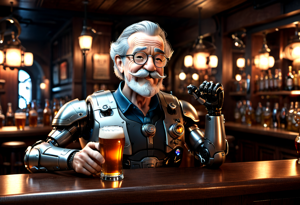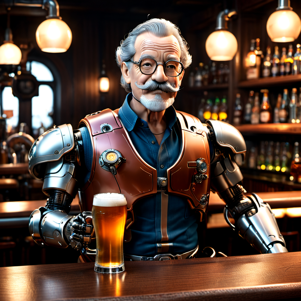 catoon style 3d model of an old man with (robot-arm) and a mustache sitting at a bar with a glass of beer, unreal engine 5 highly rendered, computer graphics, retrofuturism [Style-Selector - 3d model]