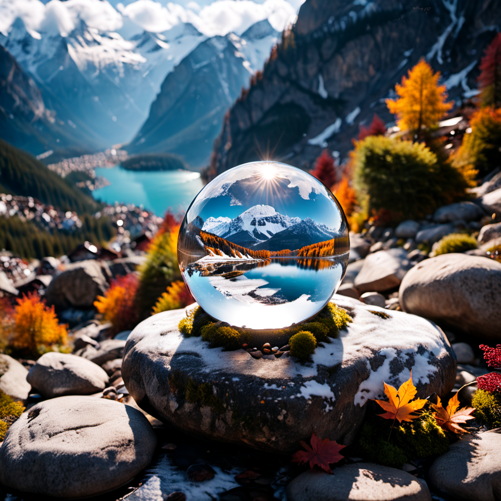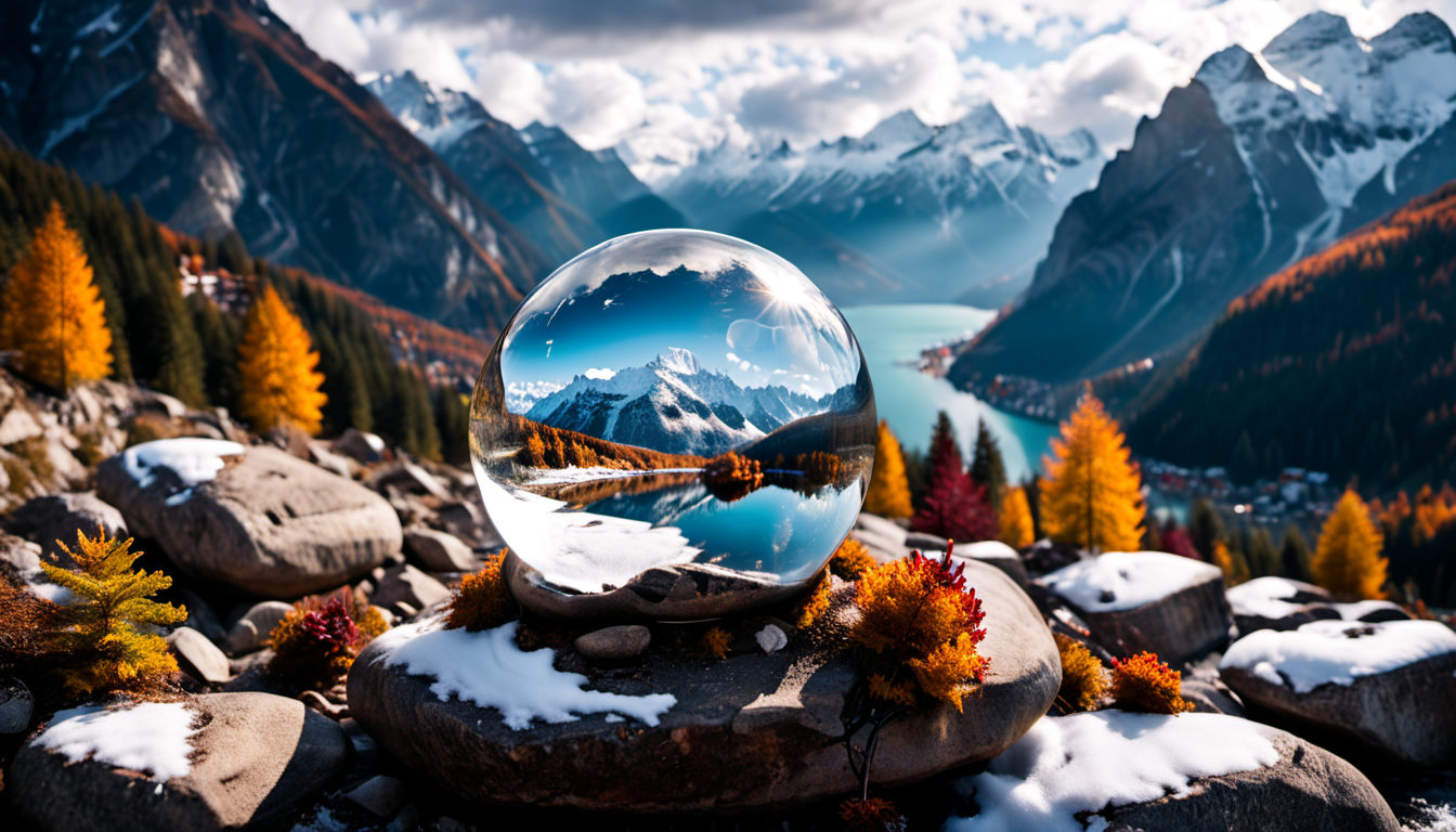 landscape photography, canon eos, Hasselblad, professional photography, glass sphere on a rock, reflections, breaking the sunlight, alpines, snow, autumn, dramatic weather, 35mm lens